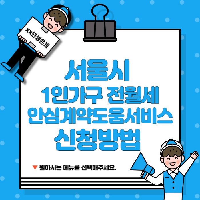 서울시 거주 혹은 거주 예정인 1인가구 분들을 위해, 전월세 계약 시 어려운 부분에 대해 상담과 동행을 지원하는 "1인가구 전월세 안심계약 서비스" 를 진행하고 있습니다. 실제 부동산업에 종사하고 계신 전문가인 주거안심 매니저를 통해 나의 상황에 맞는 서비스를 제공 받으실 수 있으니 많은 이용 바랍니다.
